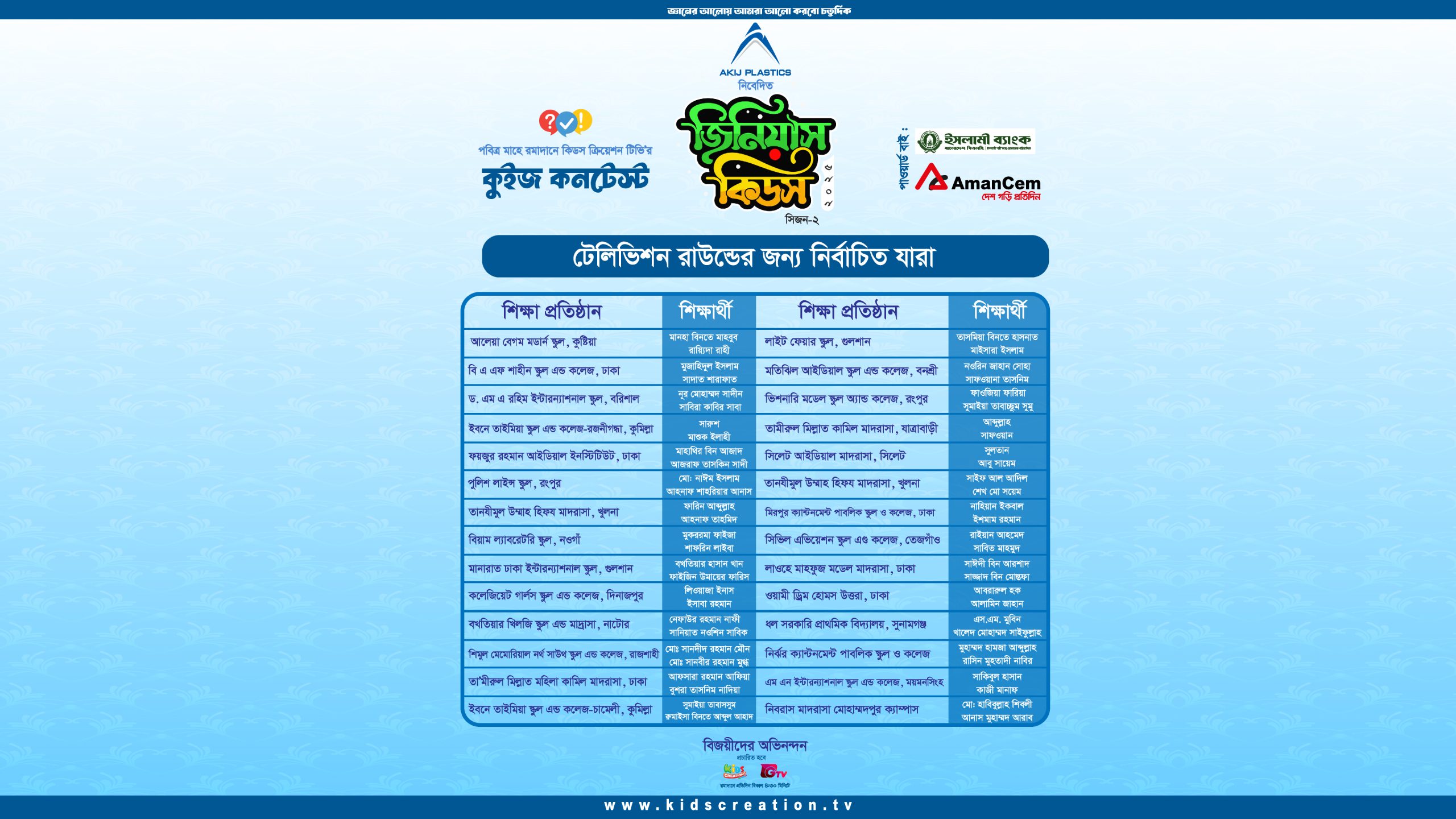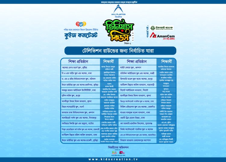 কিডস ক্রিয়েশন টিভি আয়োজিত আকিজ প্লাষ্টিকস নিবেদিত ‘জিনিয়াস কিডস সিজন ২’ এর সিলেকশন রাউন্ডের বিজয়ীদের অভিনন্দন।
